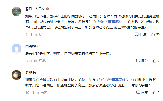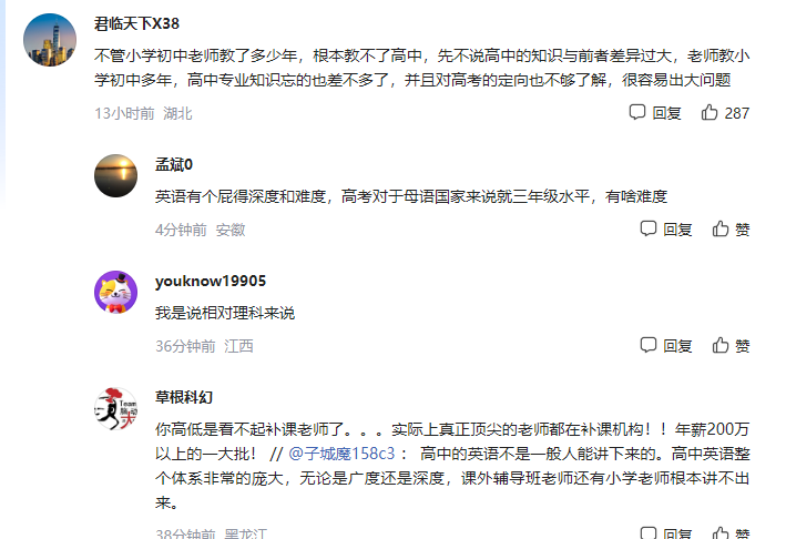 网友也表示了赞同,虽说本科大学生、研究生教小学到高中在理论上都是可以的,但知识长时间不学不练,很容易就会遗忘。“不管小学初中老师教了多少年,根本教不了高中,先不说高中的知识与前者差异过大,老师教小学初中多年,高中专业知识忘的也差不多了,并且对高考的定向也不够了解,很容易出大问题!”
