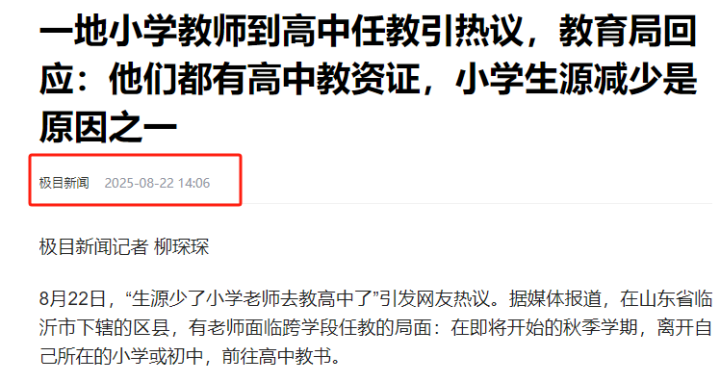 按照当地的说法,这主要是当地二胎增多,到了2032年,就读高中的人数会比较多,而经过判断,未来一段时间小学和初中的入学人数降低,于是,当地就出台了这么个办法:在2032年之前,所在区有高中教师资格证的教师,都要到高中长期任教或是短期轮岗交流。